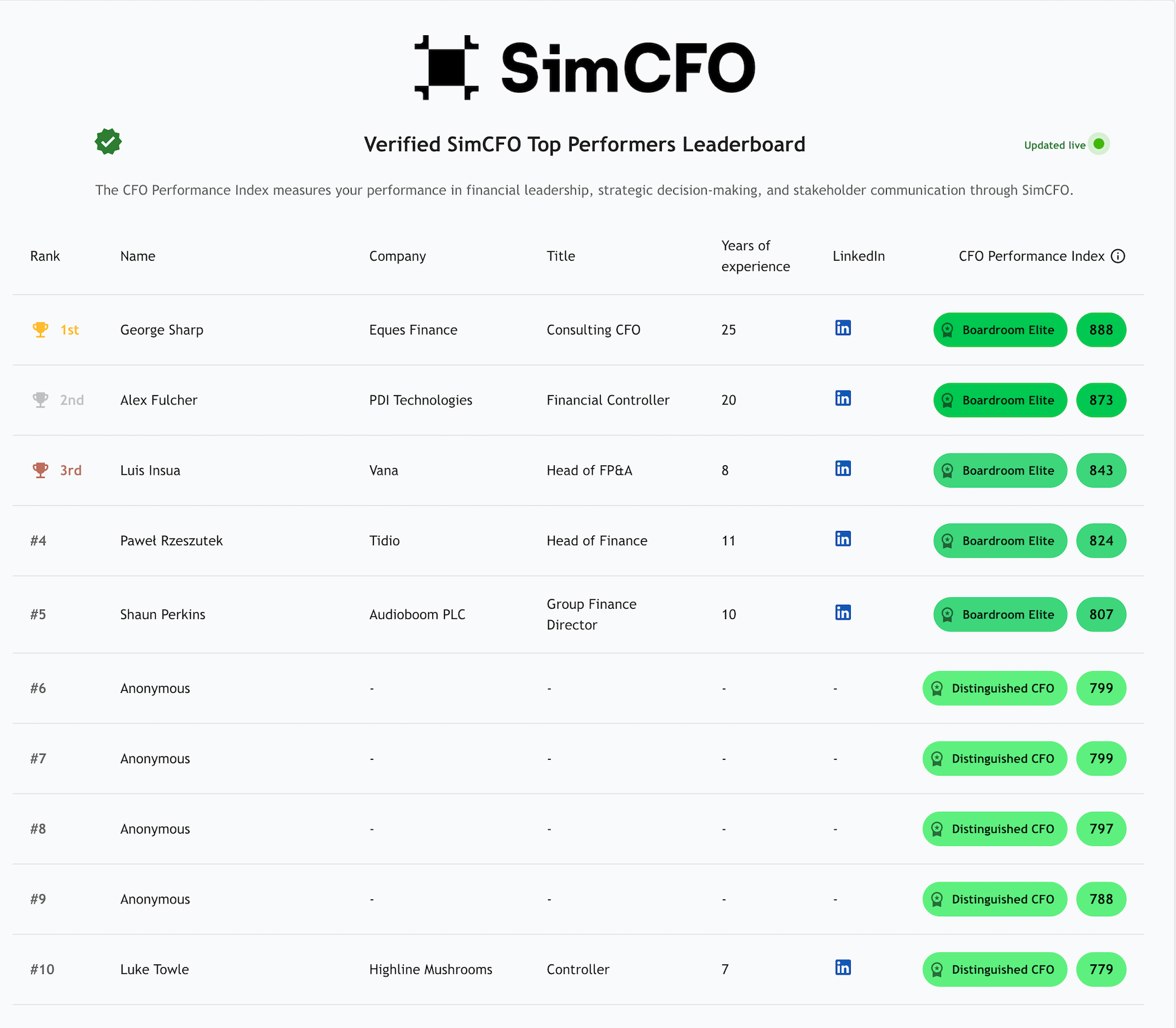 I’m not saying it’s a contest, but also … yes, it’s a contest. So here’s this week’s leaderboard of folks who completed SimCFO. Congratulations to George Sharp who is currently top of the pops…