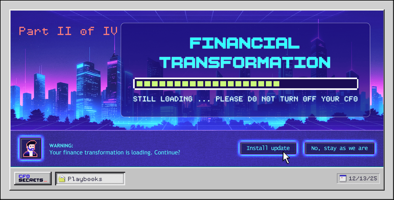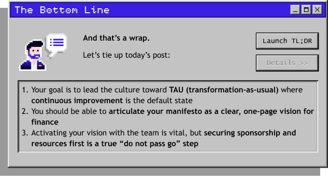 Transformation projects aren’t born out of endless Gantt charts. They are built from a clear vision and momentum. If you get this right, the tiny steps taken across the finance function every week will compound into something huge.